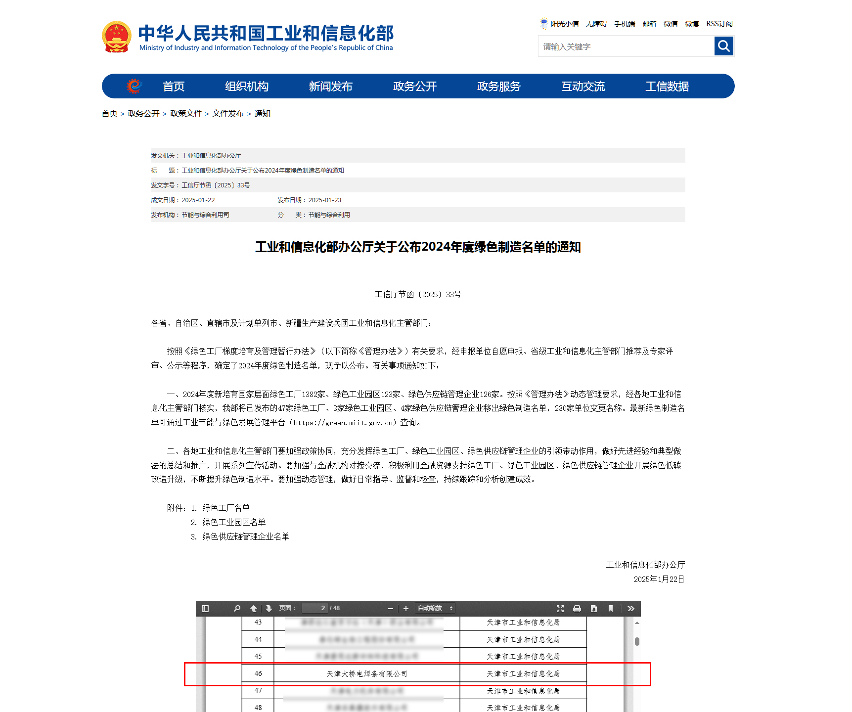 天津大桥电焊条有限公司凭借在绿色低碳、可持续发展等方面的优秀表现荣获国家级绿色工厂。